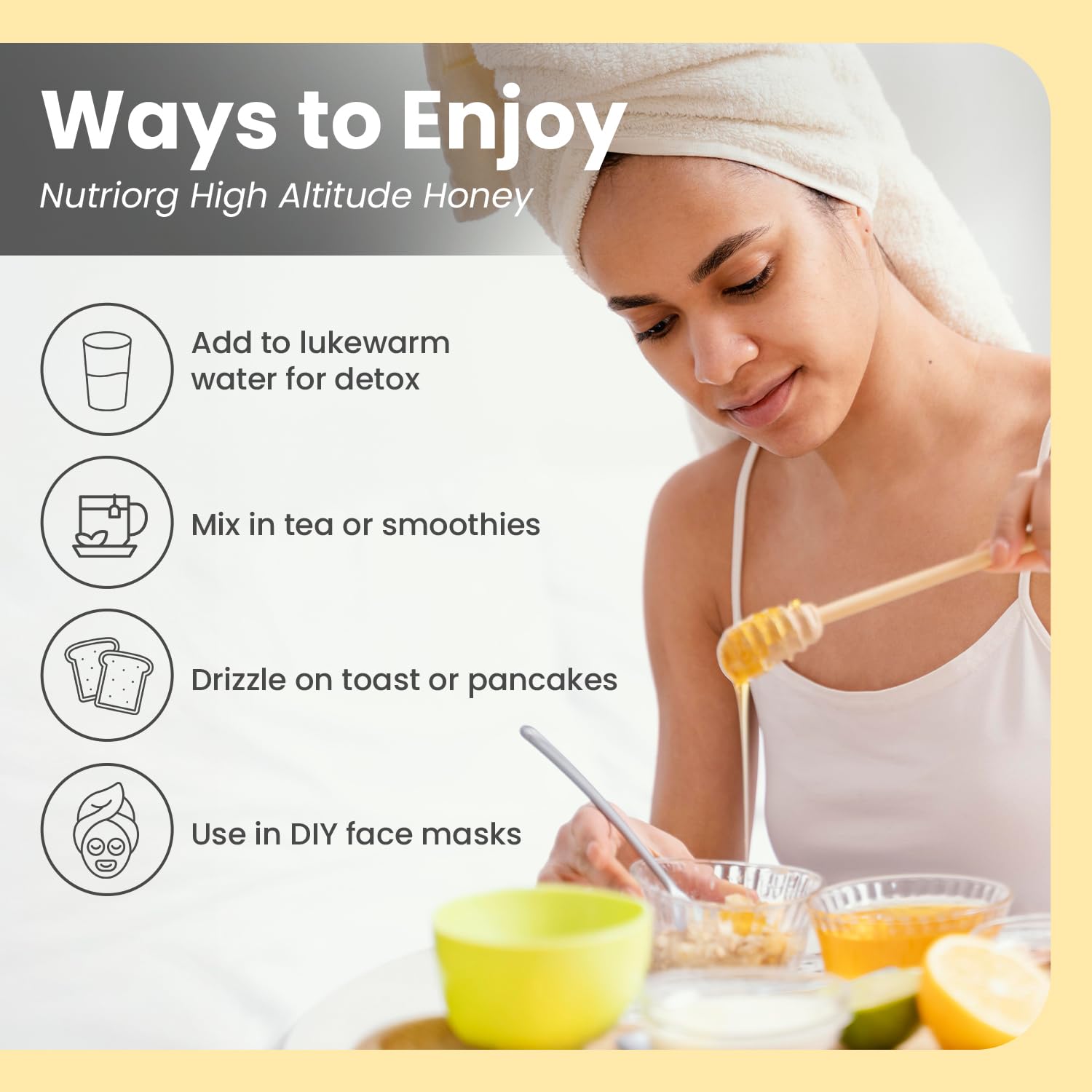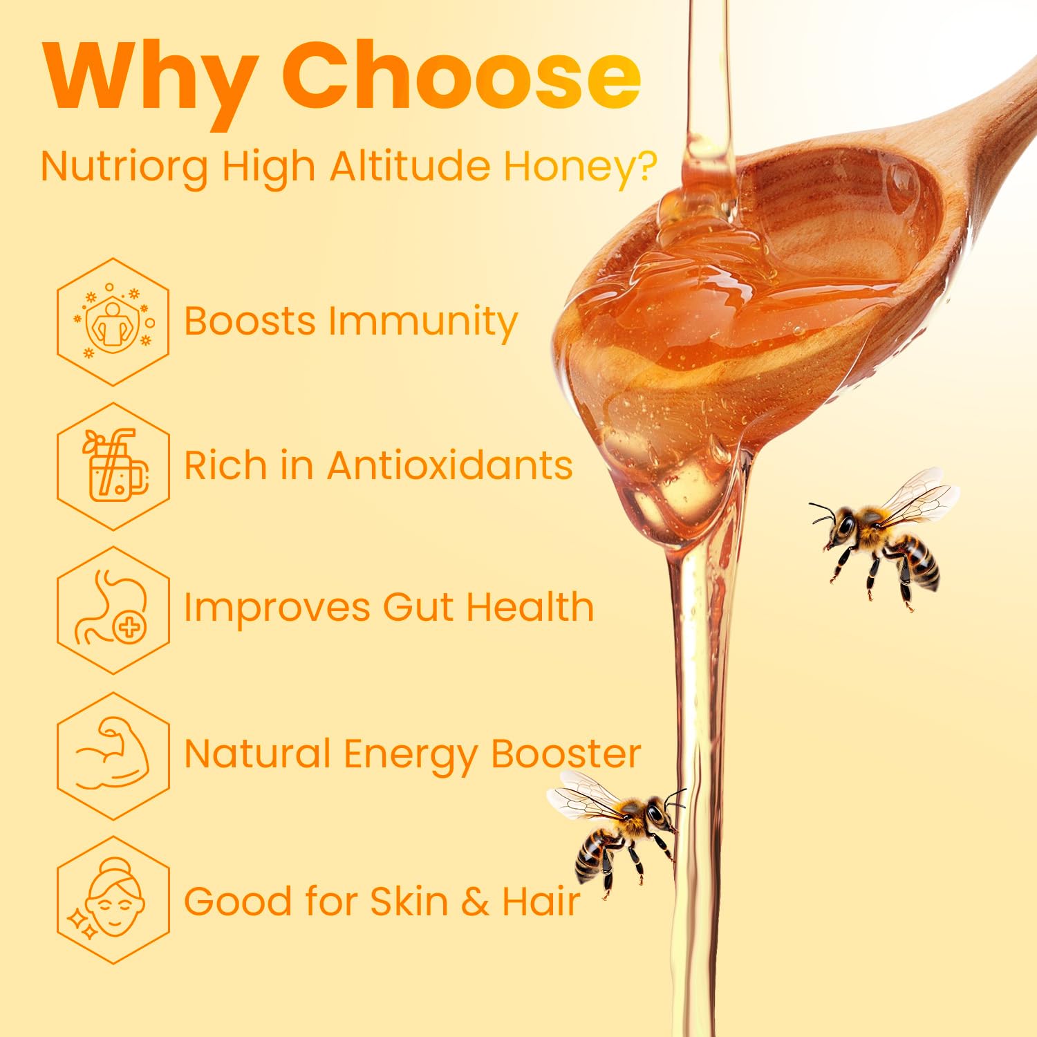 100% Pure & Unadulterated: Nutriorg High Altitude Honey is sourced from the pristine Himalayan forests, untouched by chemicals and pollutants. It is harvested sustainably, ensuring you receive a completely natural and pure product.