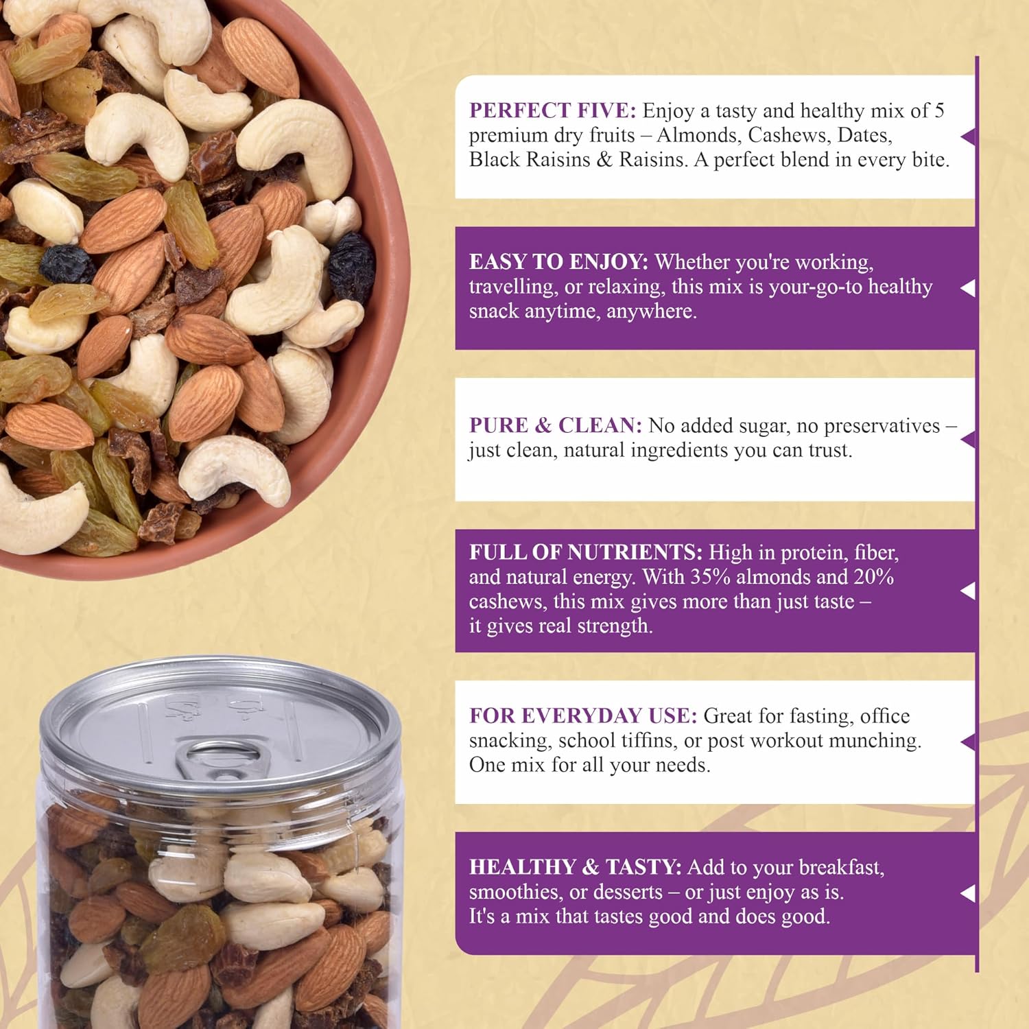 Nutty Organics Panchmeva Dry Fruit Mix is a premium blend of five wholesome dry fruits, carefully sourced to deliver taste, nutrition, and quality in every bite. This 400 gm pack contains a rich mix of California Almonds (35%), Goa Cashews (20%), Oman Dates (20%), Black Raisins (15%), and Green Raisins (10%). Perfect as a healthy snack, this dry fruit mix is naturally rich in protein, fiber, antioxidants, and essential vitamins. Whether you enjoy it as an energy booster during work, a quick pre/post-workout snack, or as a nutritious topping for cereals, desserts, and smoothies, Panchmeva offers the perfect balance of taste and health. Packed hygienically to preserve freshness and crunch, it’s a great choice for gifting or everyday snacking. ✔ Premium handpicked dry fruits ✔ Rich source of energy and nutrients ✔ No artificial colors, flavors, or preservatives ✔ Ideal for healthy snacking, gifting, or festive occasions