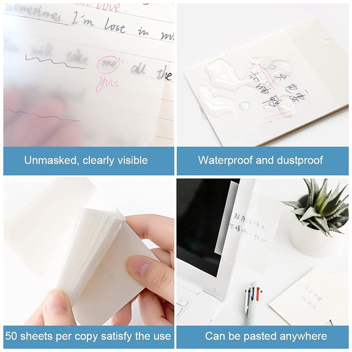 【IDEAL FOR】: Ideal for school (students, teachers), offices, study rooms, or family use. You can stick the transparent notes on books, notes, bible, doors, walls, whiteboards, table tops, bathroom mirrors, schools, homes and other places. Can be used to leave notes, fridges, chalkboards, whiteboards, laptops or anywhere else. It’s the perfect choice for your studies, your work and your life.