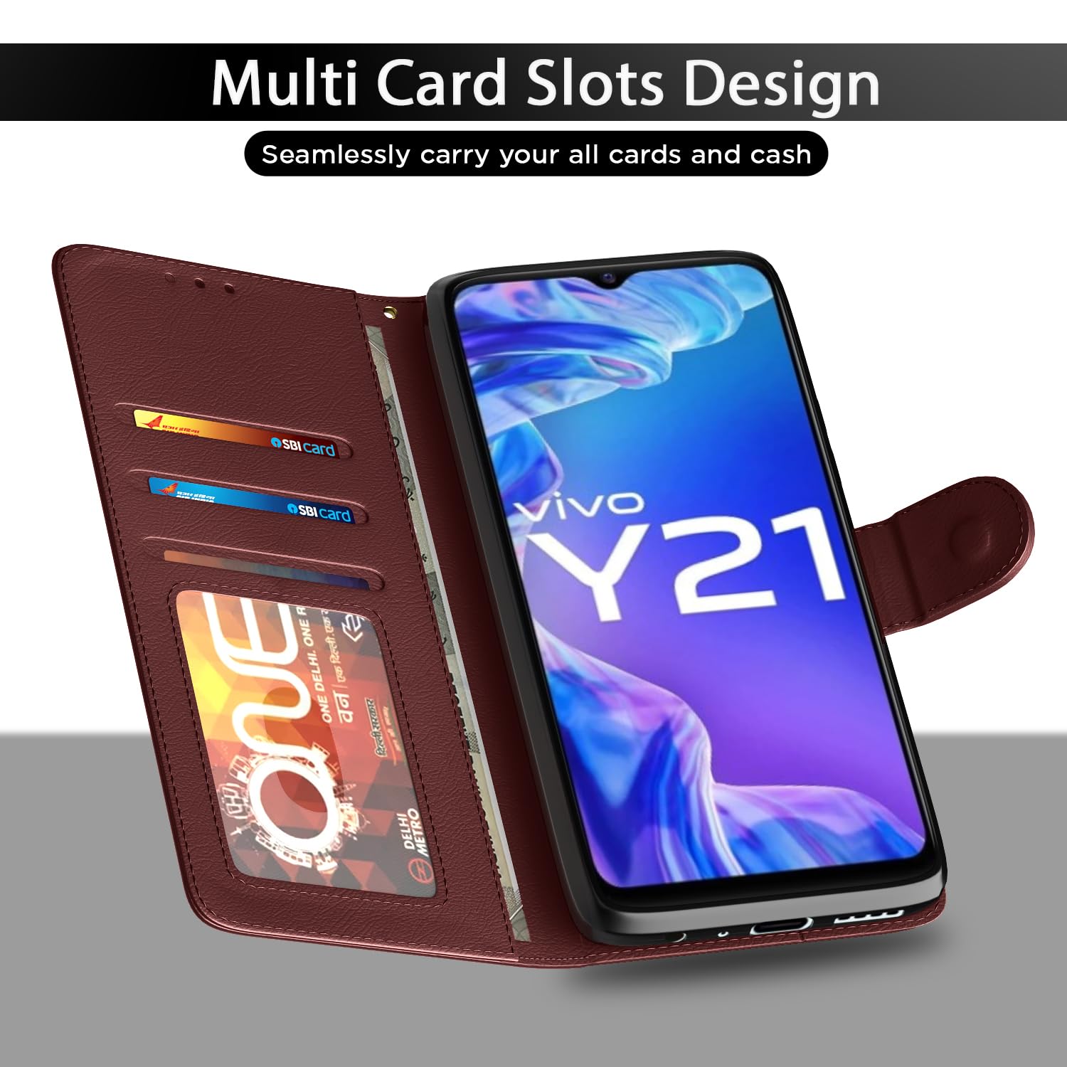Pikkme Vivo Y21 2021 Flip Cover Leather Finish Wallet Back Case for Vivo Y21 2021 (Brown)