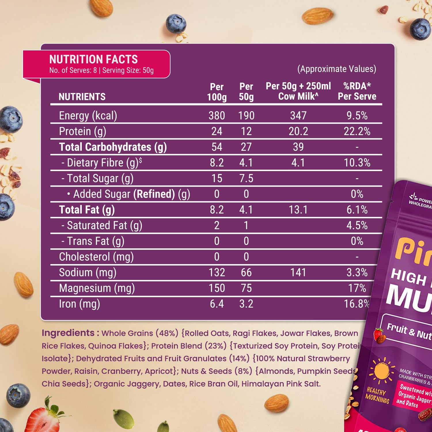 Power of 5 Wholegrains: Crafted with oats, ragi, quinoa, jowar & brown rice flakes for a nutrient-rich, wholesome breakfast.