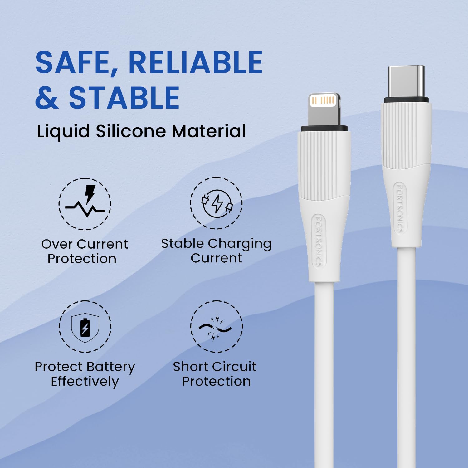 Durable and Flexible: Built to withstand wear and tear, the Portronics Silklink Type C TO 8-Pin cable is crafted from premium silicone material that can endure daily wear and tear, ensuring long-lasting performance and reliability.