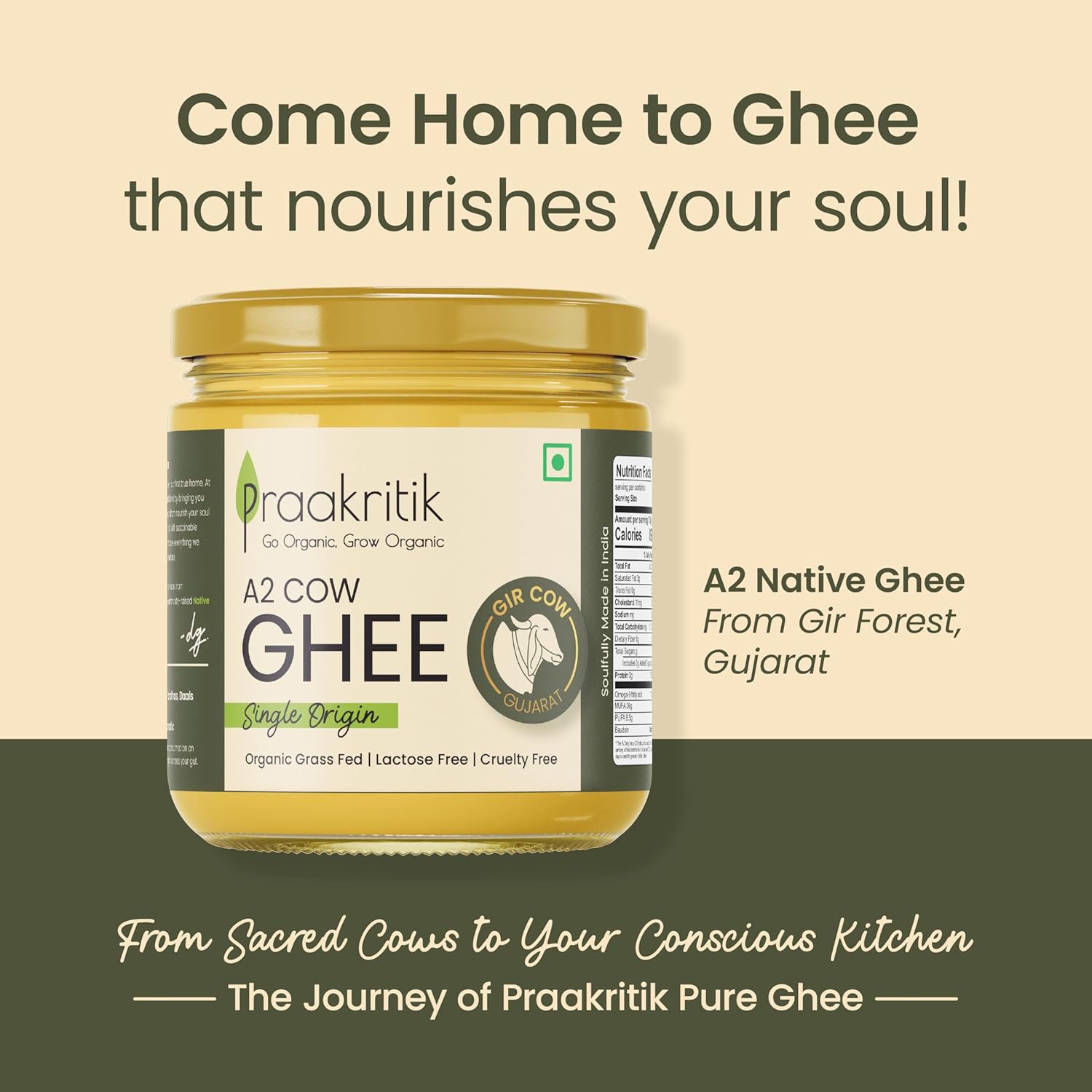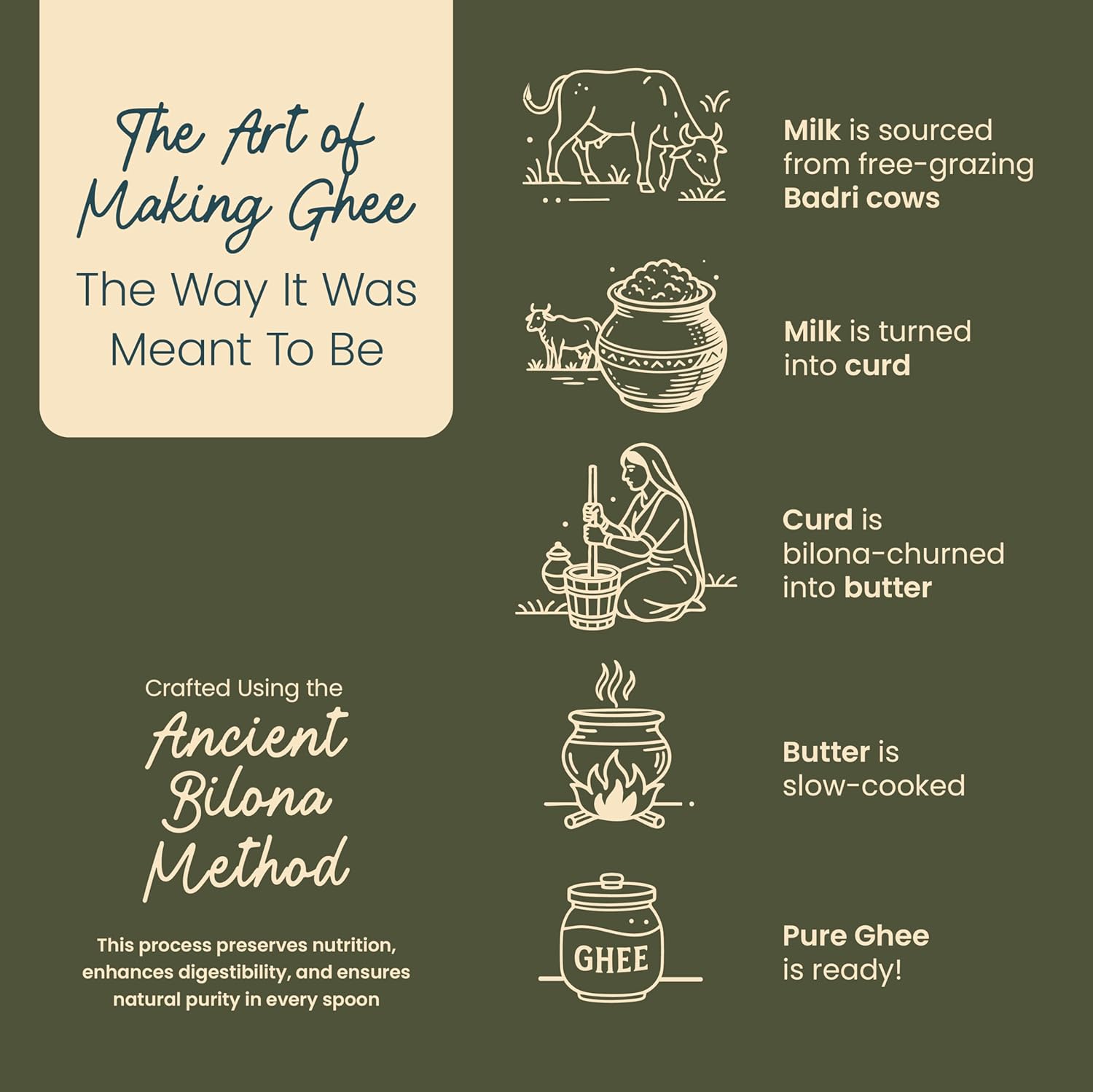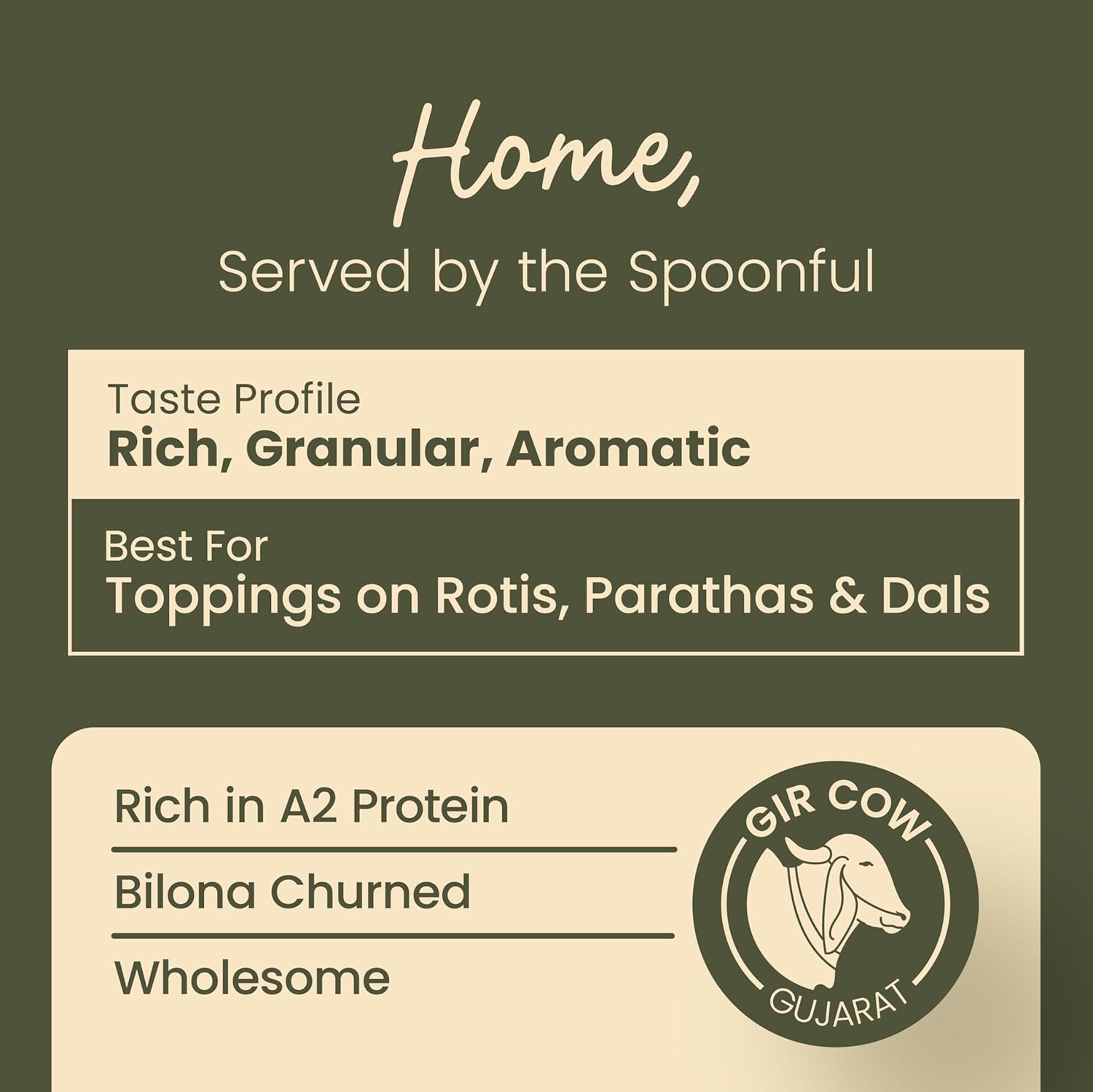 Crafted by the traditional method of churning curd made from the milk of grass-fed gir cows in Maharashtra and Gujarat.