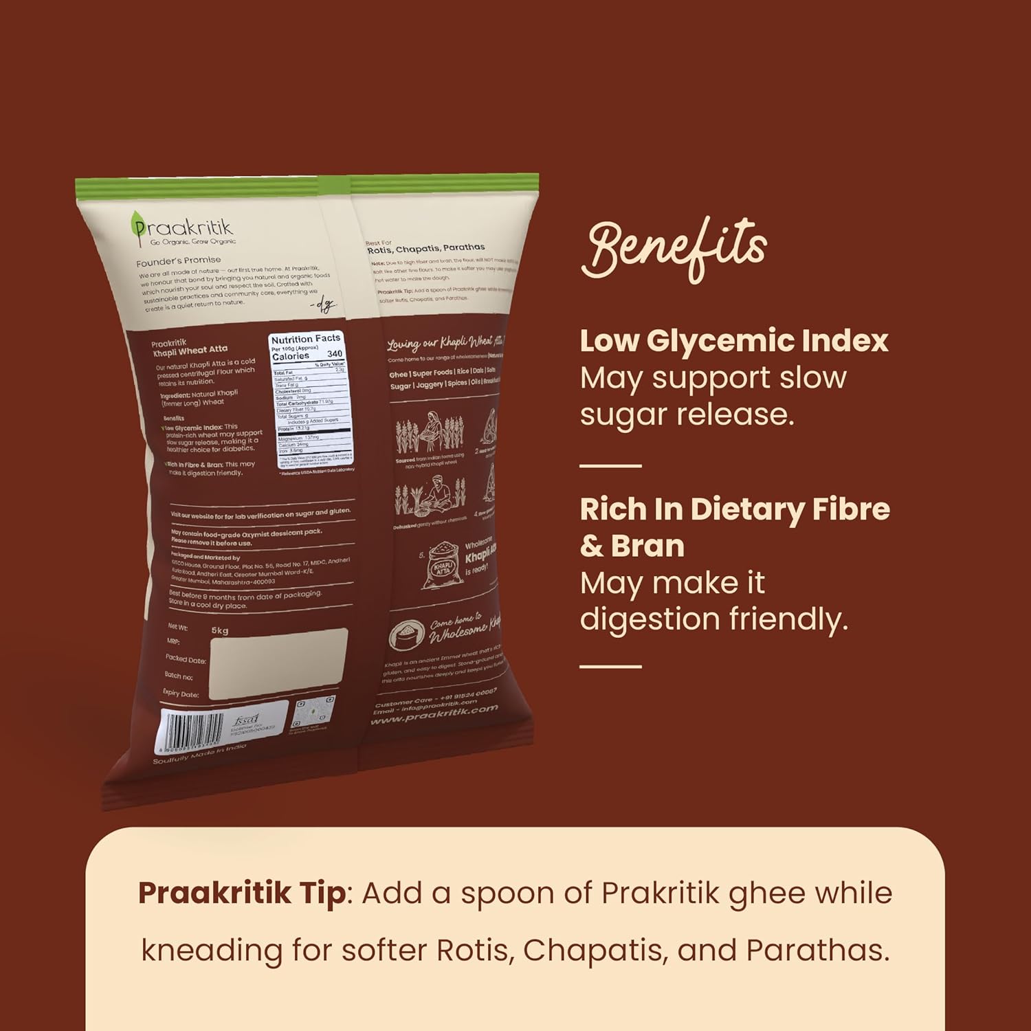 Praakritik Natural Khapli Wheat Atta 5 Kg, Emmer Wheat Flour, High Fiber, Low Gluten & Diabetes-Friendly, Ancient Grain, Easy Digestion