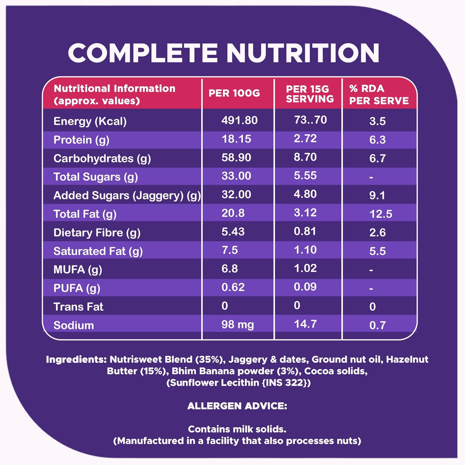 Powered by Bhim Banana & Millets: Bhim Banana from Assam, millets, oats, cranberries, beetroot, cocoa, hazelnut butter, milk solids, jaggery, dates; no maida, no palm oil, no refined sugar, no preservatives.