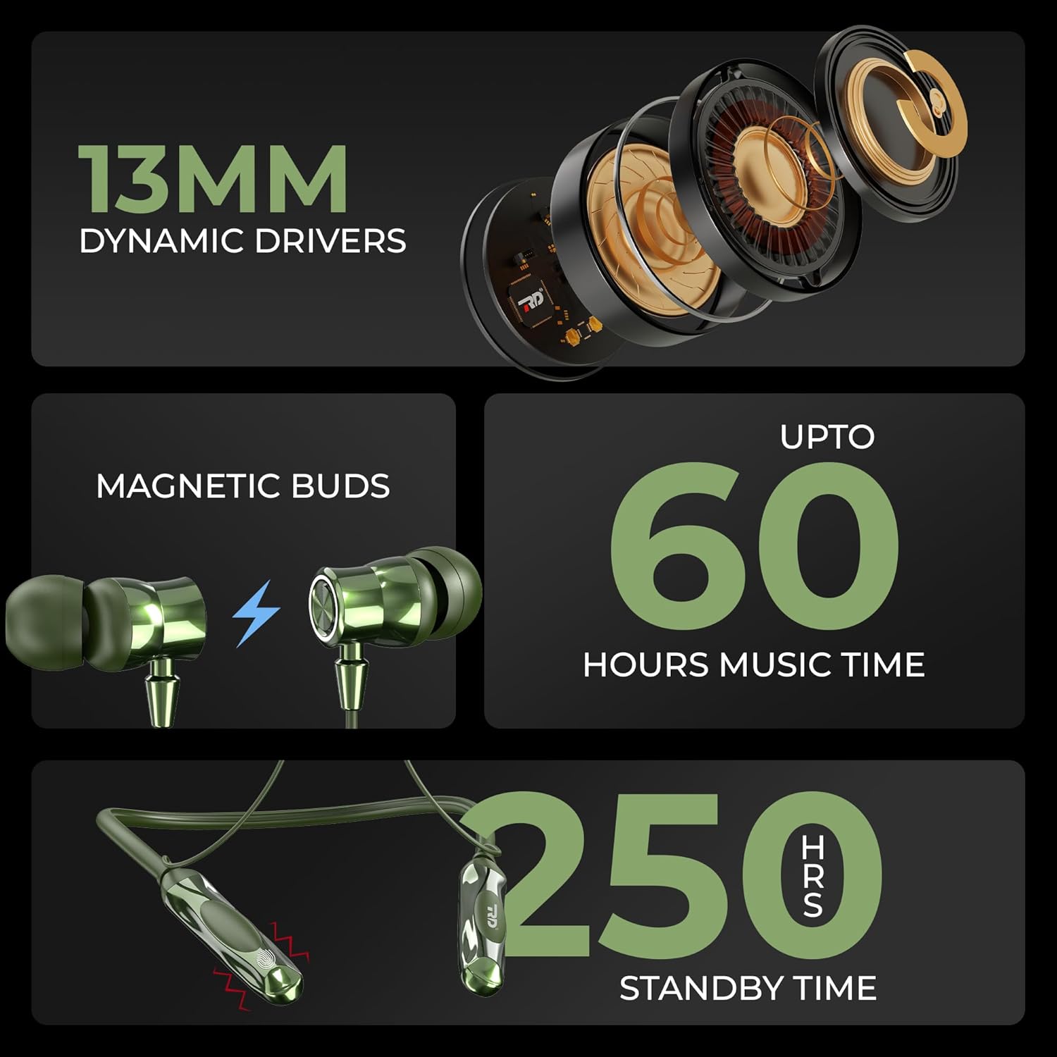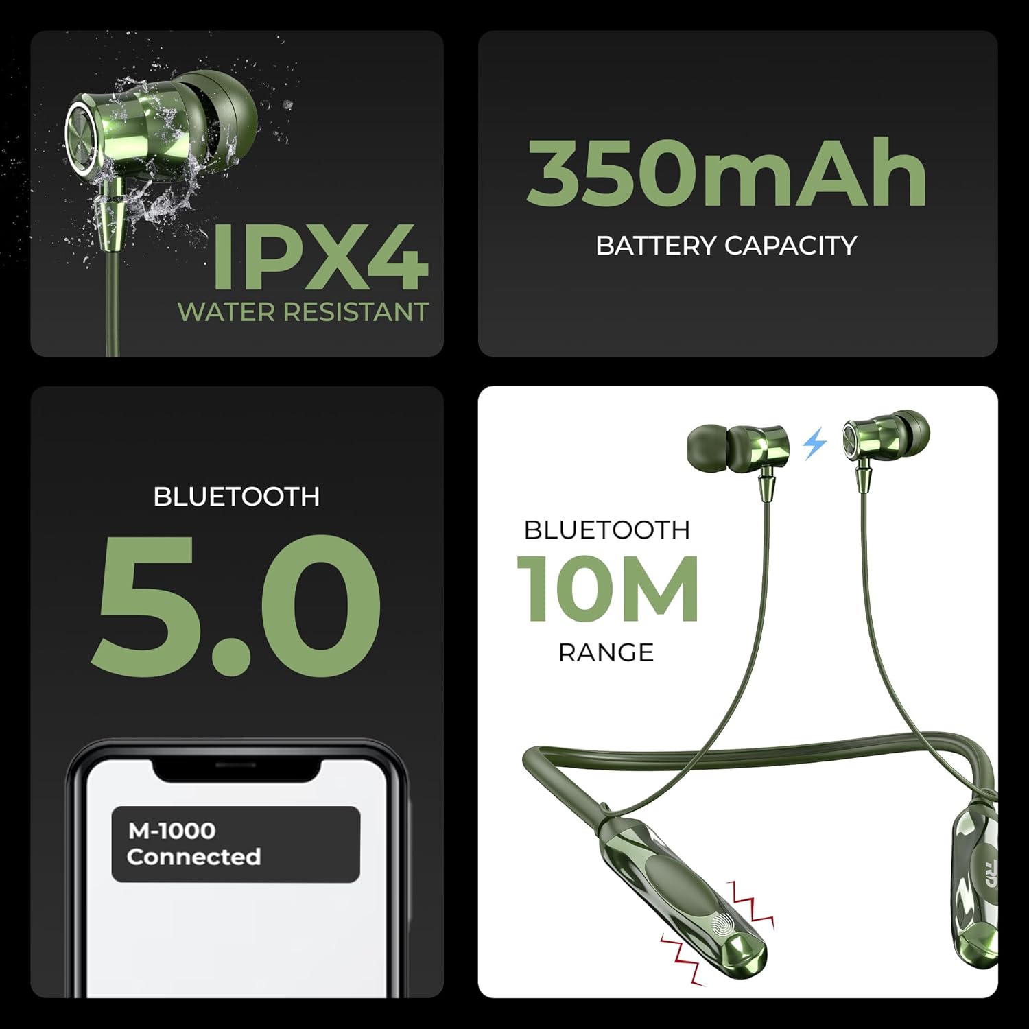 RD M-1000 Bluetooth Neckband 13Mm Drivers, 60 Hours Playtime, Ipx4 Sweat Proof Wireless Bluetooth In Ear Earphones, Support Asap Charging, Environmental Noise Cancellation – Green