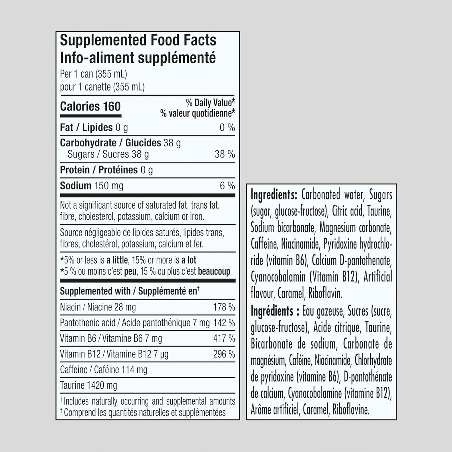 Water Sucrose, Glucose, Acidulant (Citric Acid), Carbon Dioxide, Taurine (0.4%), Acidity Regulator (Sodium Citrate), Flavours (natural and artificial), Caffeine (0.03%), Colours (Caramel, Beta-apo-8-Carotenal), Stabilizers (Glycerol Ester of Wood Rosin, Sucrose Acetate Isobutyrate), Vitamins (Niacin, Bó, B2, B12).