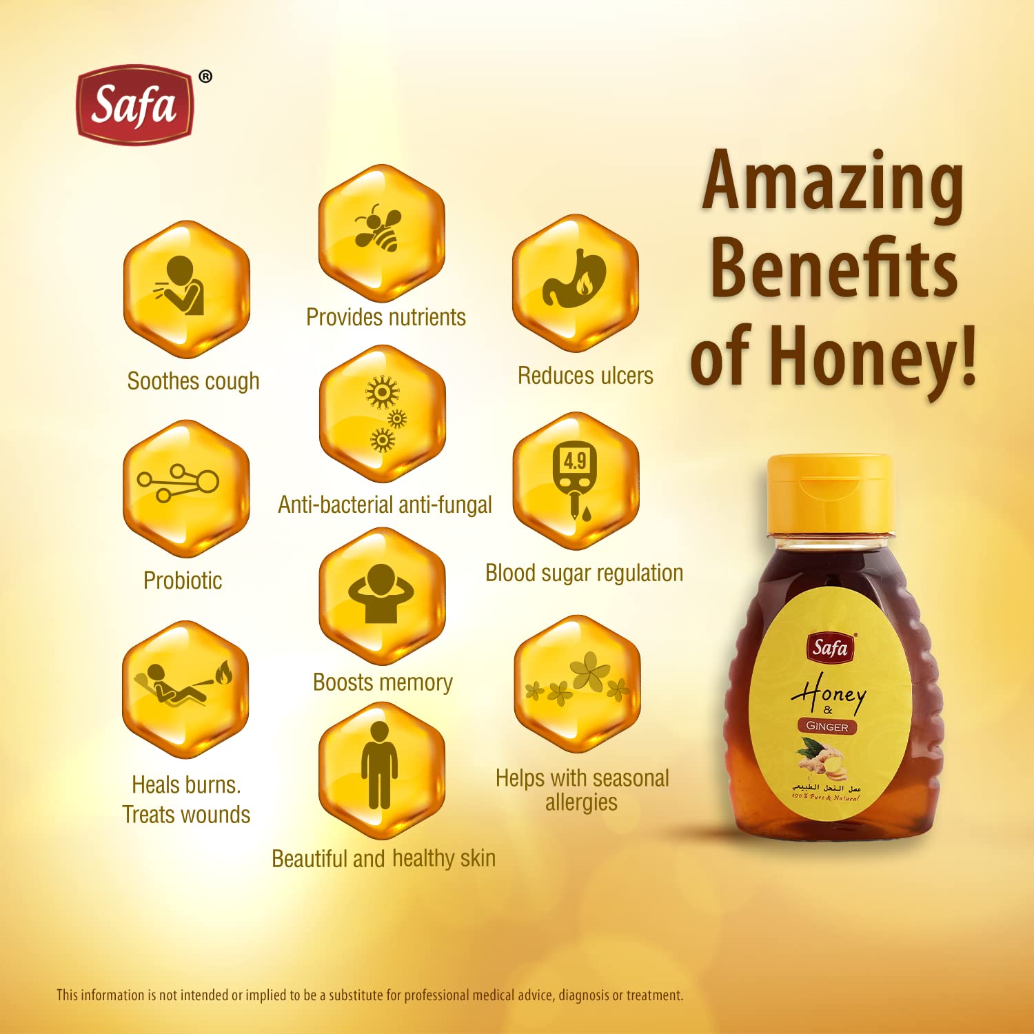 Safa Ginger Honey | 100% Pure Raw Honey with Ginger Natural Organic Unheated | Relief from Sore Throat, Common Cold, Supports Digestive Health | Immunity Boosters For Adults And Children | 250g