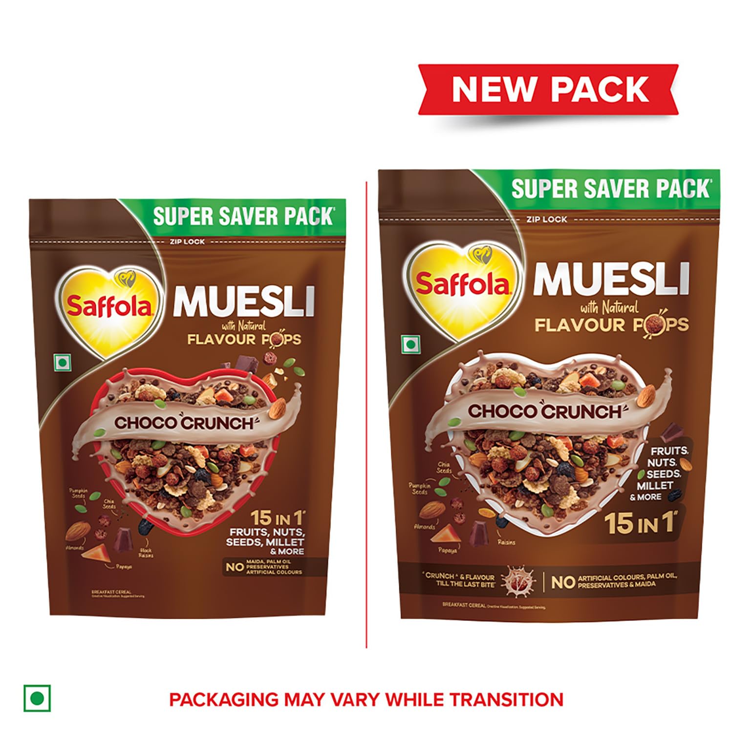 Saffola Muesli Choco Crunch with Flavour Pops, 700 gm | 15 in 1 Fruit and Nuts, Seeds, Millet & more | Cereals for breakfast rich in wholegrain, protein, fibre