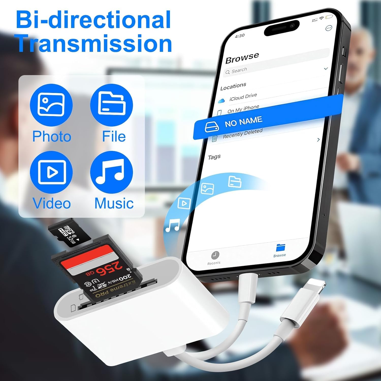 Easy Plug and Play: No need for third-party apps, Wi-Fi, internet, or external power sources; Simply plug in the card reader to your device and start transferring files instantly using your device’s built-in file or photo app; Supports two-way file transfer between devices and external storage