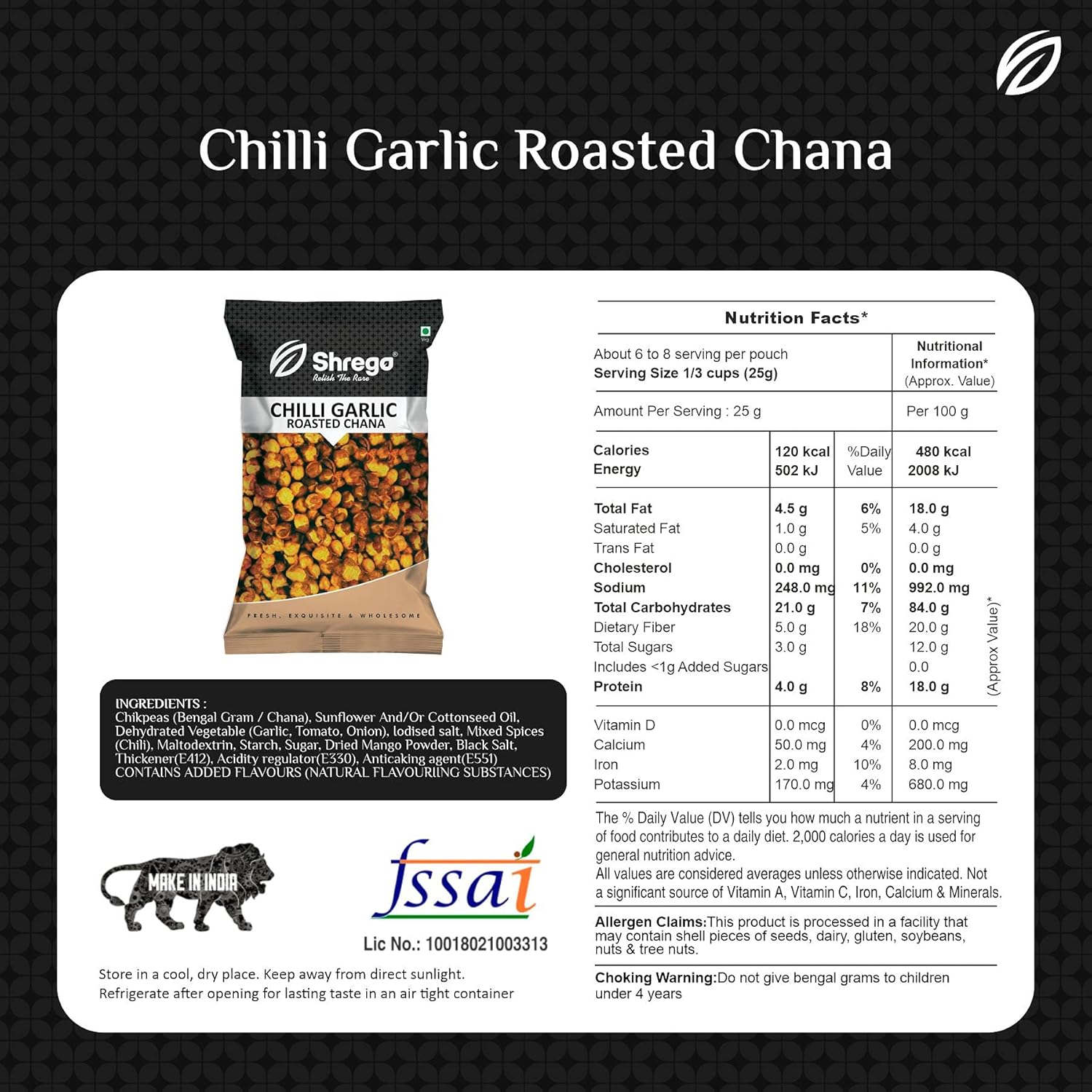 Hot & spicyNo artificial colours and flavoursUniformly roasted chana (non fried), desi chickpeasGuilt free healthy roasted chana snack; for those moments between meals, we offer a delicious healthy snacks in the form of roasted chana seasoned with exotic flavours. Our authentic roasted chana munchies do not contain any artificial flavour or colours which gives you a guilt-free snacking experience that you are sure to love.Package Content: 150 Gm of Roasted Chana; Quantity: 150 Gm