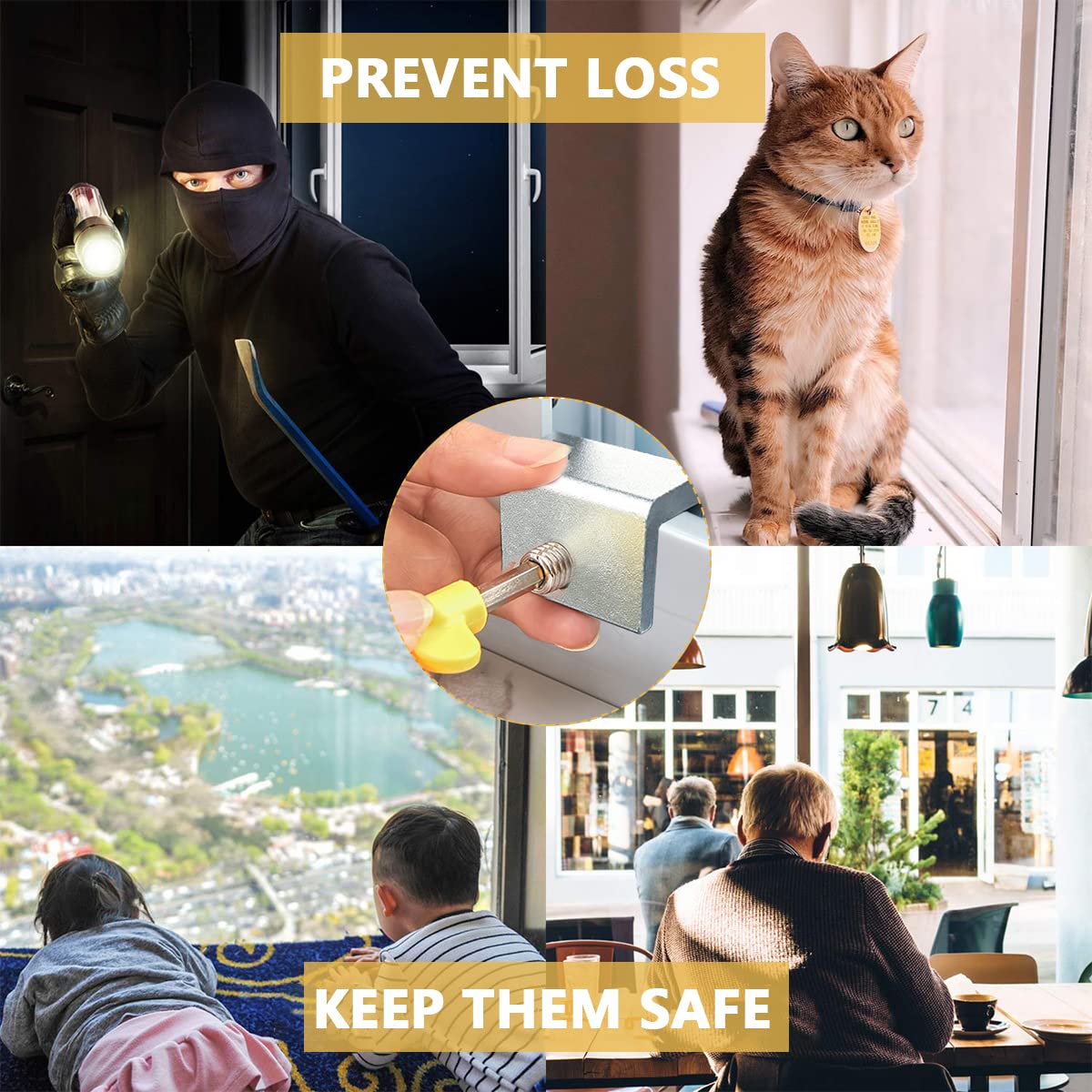 SAFETY WINDOW LOCK: Another guards for home safety,effectively reduce the risk of children and pets openning high windows and breaking in from out. By locking your windows, it can also protect your property against damage during heavy rains and hurricanes, or guard against theft and avoid property damage during your traveling period.