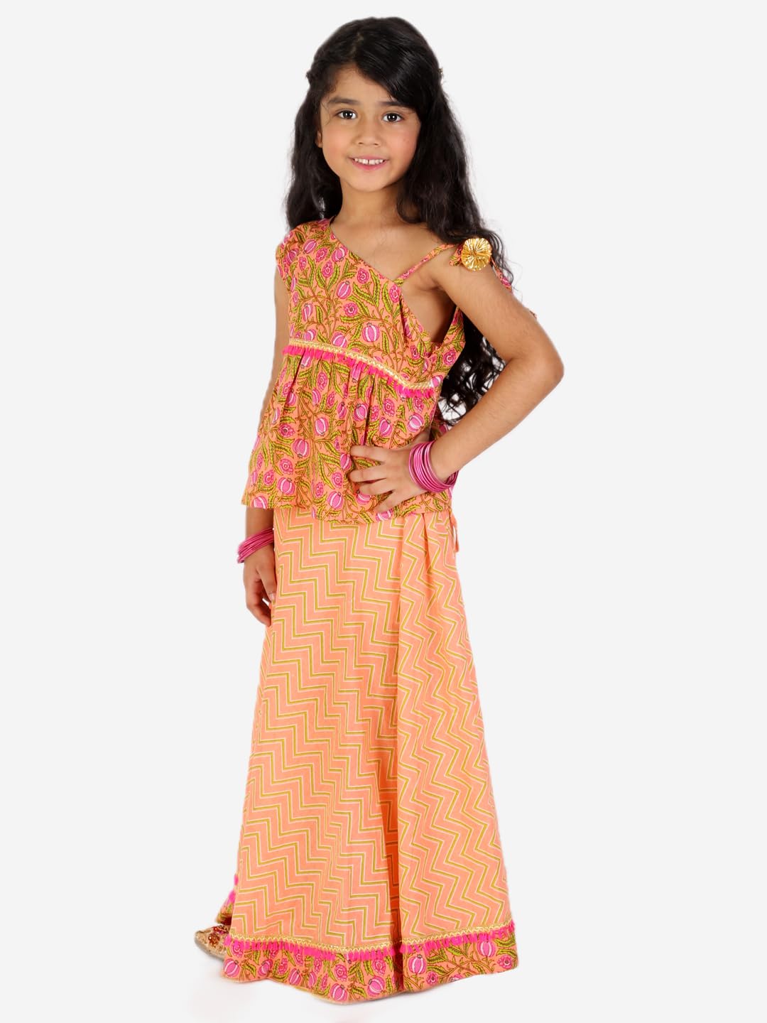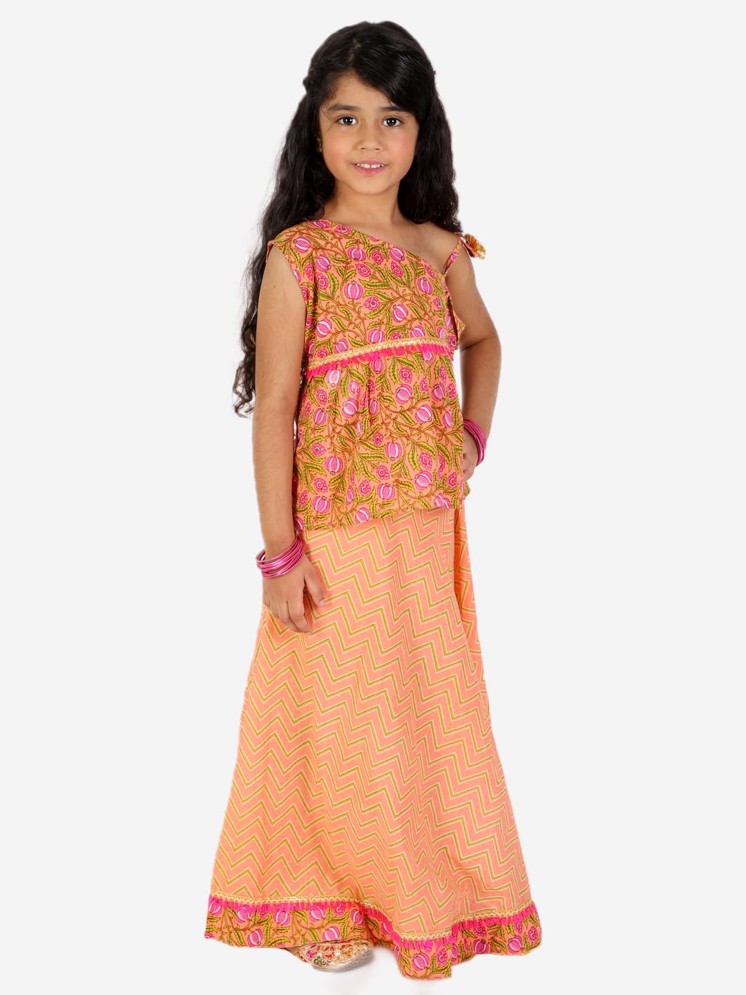 superminis Baby Girl’s Cotton Jaipuri Print One Side Off Shoulder Top/Kurti And Printed Lehnga/Skirt With Dori Closure Dress Clothing Set