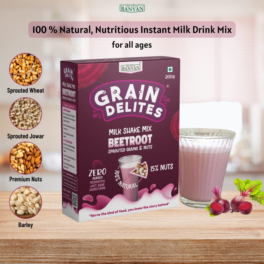 The Great Banyan GrainDelites Milkshake Mix – Beetroot, Sprouted Grains, Millets and Nuts 200g – 100% Natural, No Refined Sugar Drink Mix for Kids and Adults
