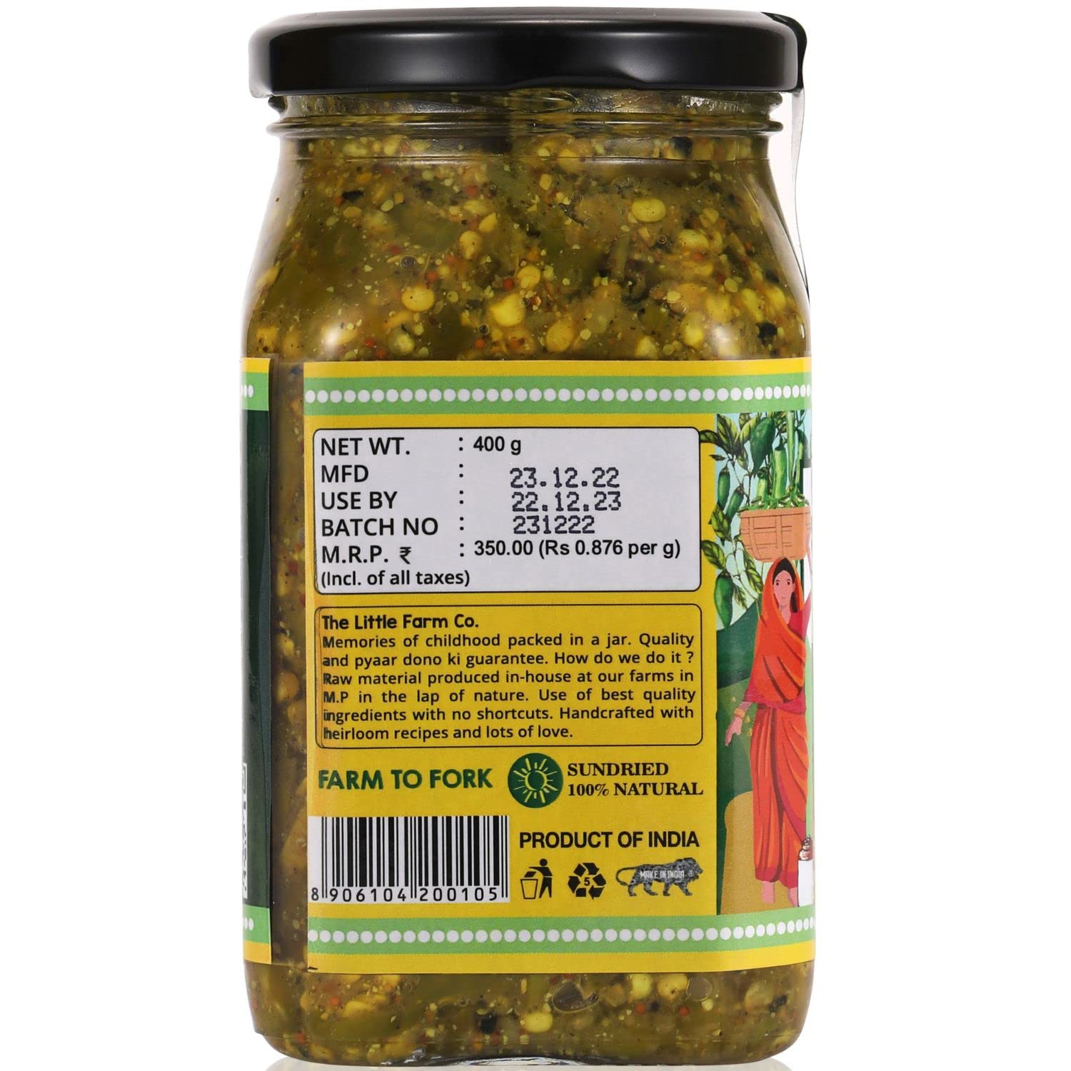 BEST QUALITY INGREDIENTS : Made in cold pressed mustard oil , Pink salt, natural spices and green chillies from our own farms in Madhya Pradesh. Green chilli, black mustard, jeera, saunf, methi dana, himalayan pink salt, turmeric, garam masala, hing, lemon juice, cold pressed mustard oil