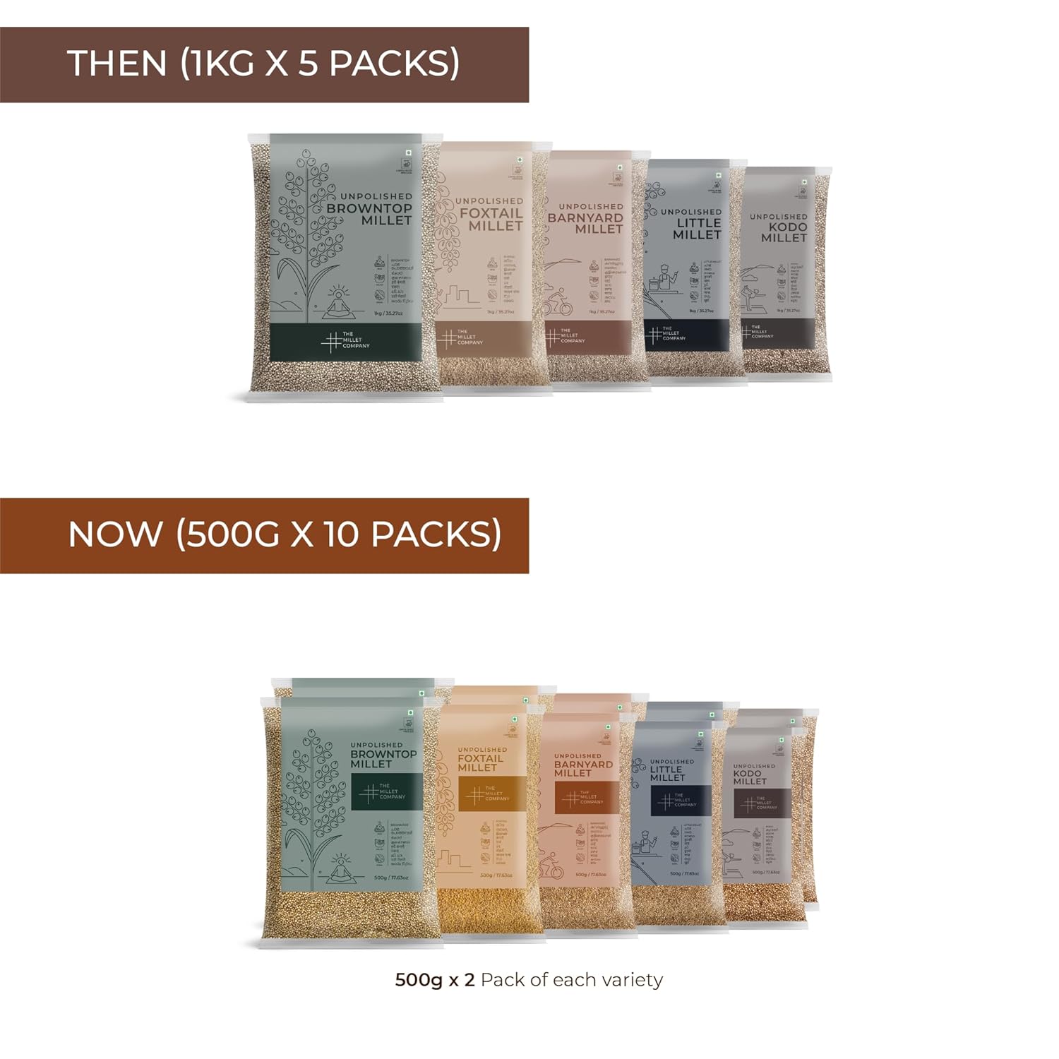 The Millet Company 1 kg [500g x 2] Unpolished Millet Combo Pack of 5, Browntop, Foxtail, Kodo, Barnyard, and Little Millet [Total 5 kg], Natural Farm Grown, High Fibre Millets