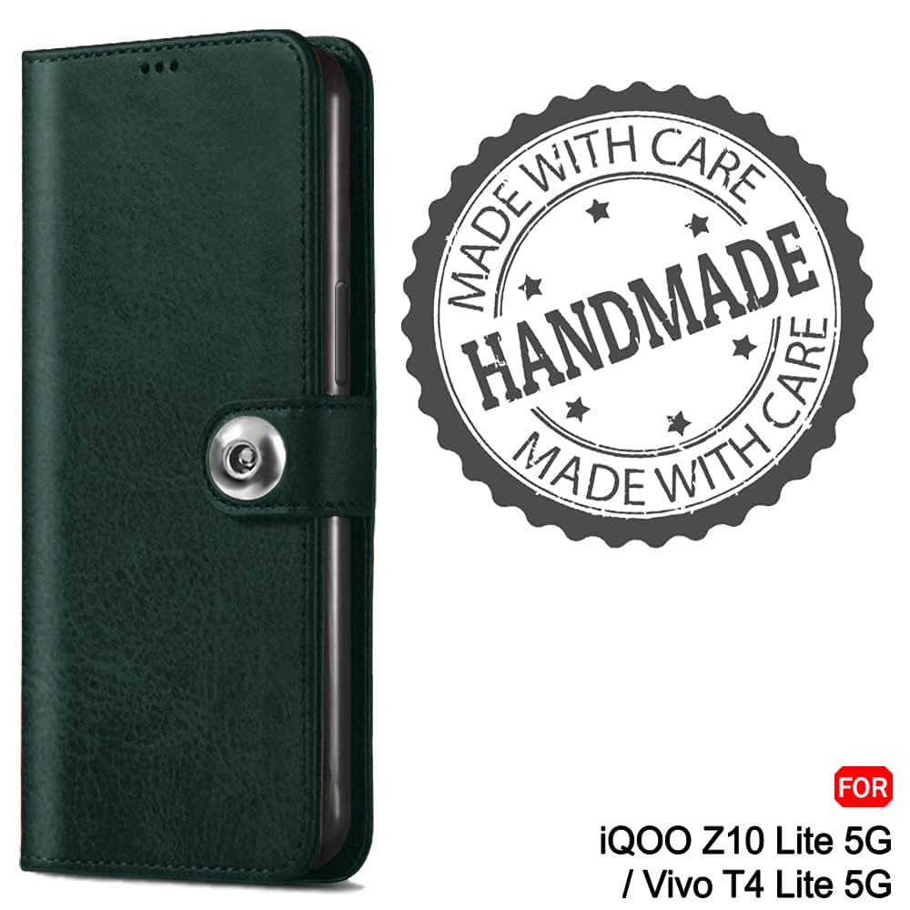 TheGiftKart Flip Cover Back Case for iQOO Z10 Lite 5G / Vivo T4 Lite 5G | Genuine Leather Finish | Designer Button | Inbuilt Pockets & Stand | Wallet Style Flip Back Cover Case (Faux Leather, Green)