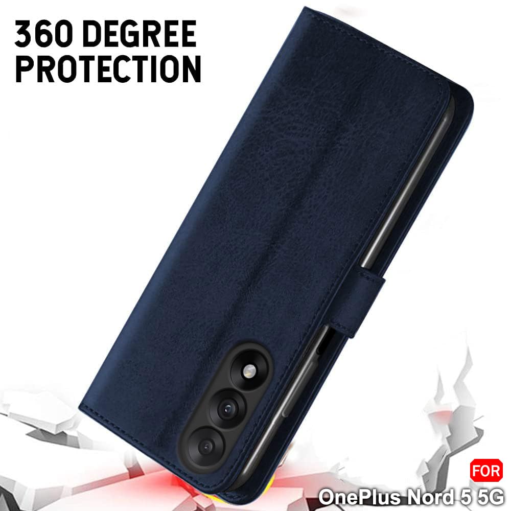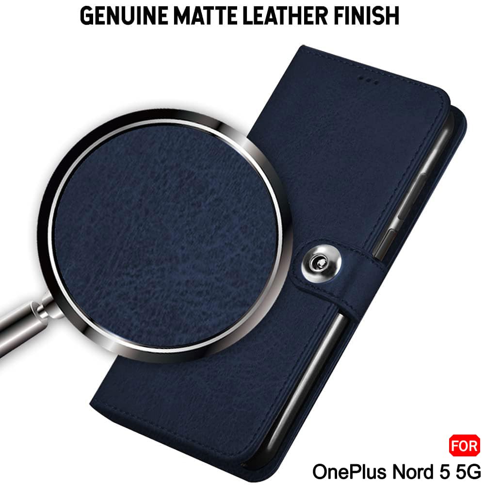 TheGiftKart Genuine Leather Finish Flip Back Cover Case for OnePlus Nord 5 5G | Inbuilt Pockets & Stand | Wallet Style | Designer Button | Flip Cover Back Case for OnePlus Nord 5 (Faux Leather, Blue)