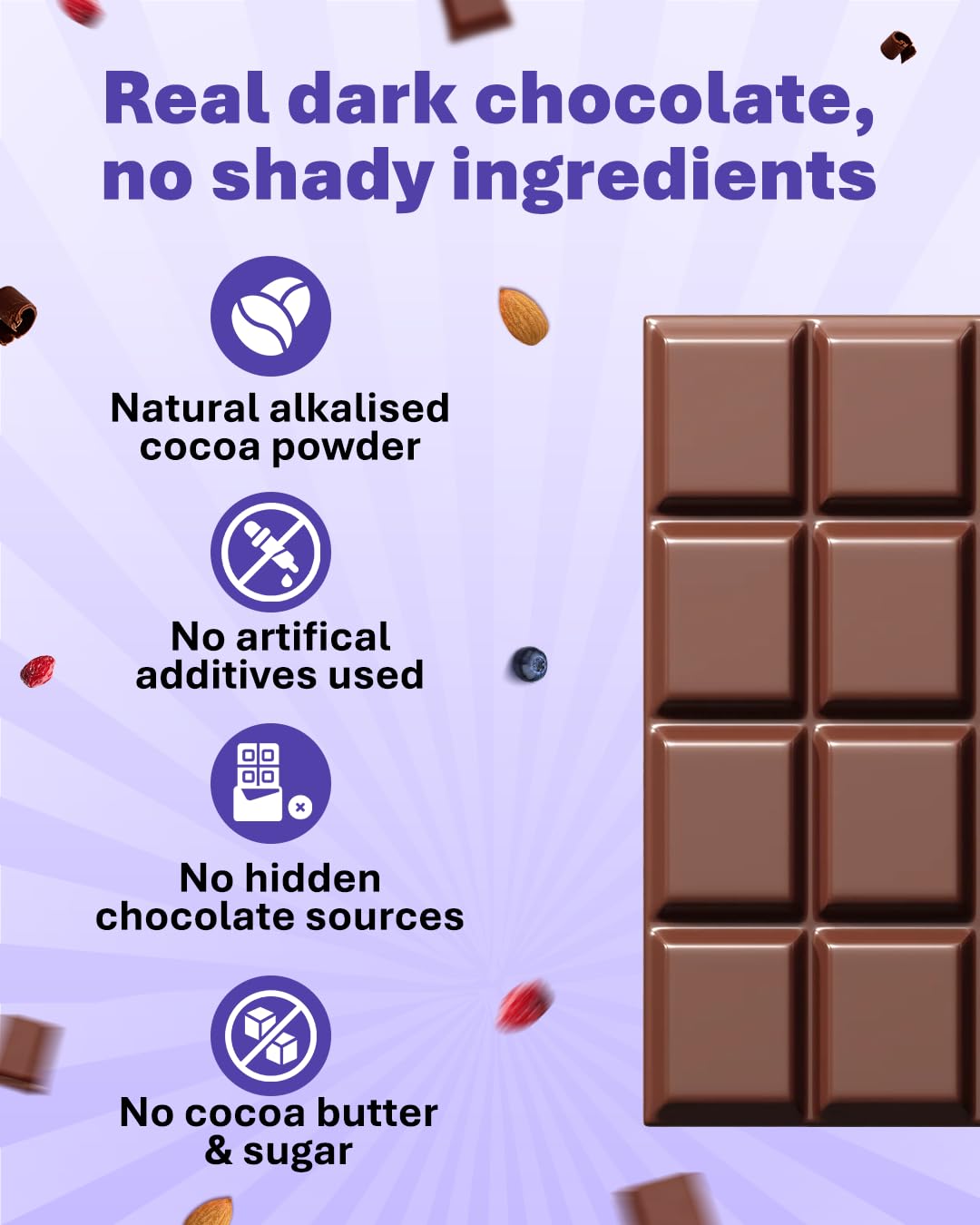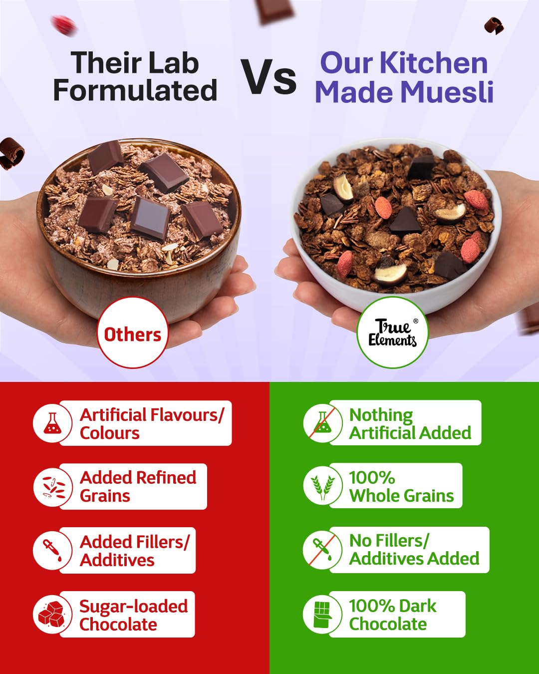 DARK CHOCOLATE INDULGENCE: Rich dark chocolate muesli enhanced with natural cocoa powder and jaggery powder for a delightful breakfast experience