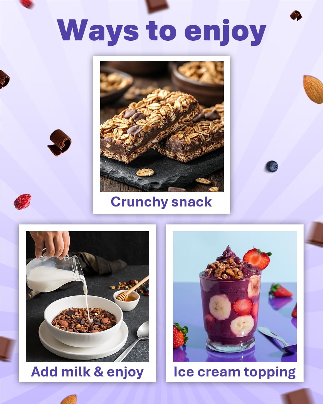 VERSATILE SERVING: Can be enjoyed with hot/cold milk, as a snack, or as a topping on yoghurt, fruit salad, or ice cream