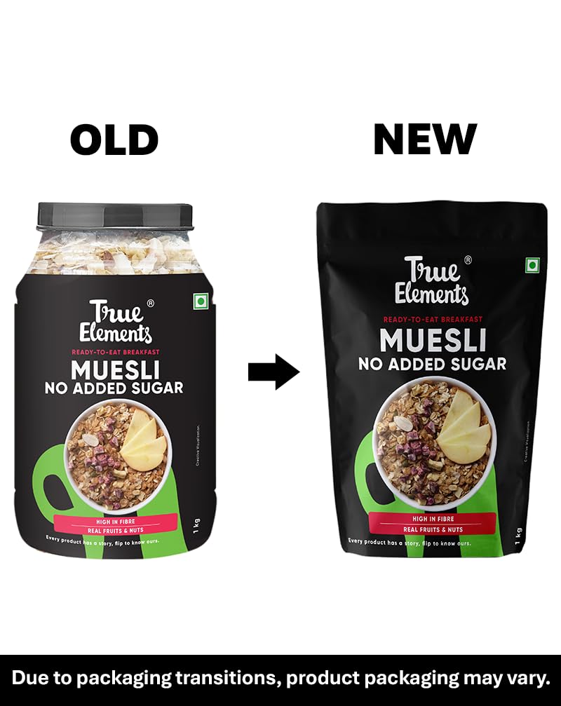 True Elements Muesli No Added Sugar 1 Kg | Sugar Free Cereal | Diet Food | Healthy and Quick Breakfast | No Malt Extract, No Malitol, No Sweeteners or Flavourings | Oats, Wheat Flakes & Jowar | Crunchy Almonds, Seeds & Freeze dried fruits | 13g Clean Protein