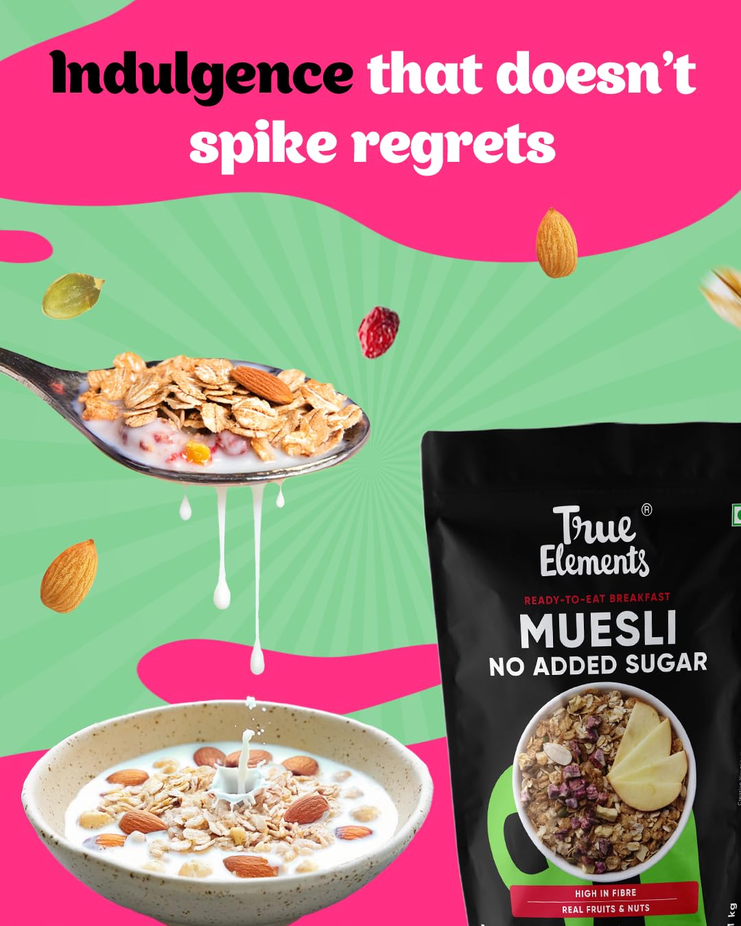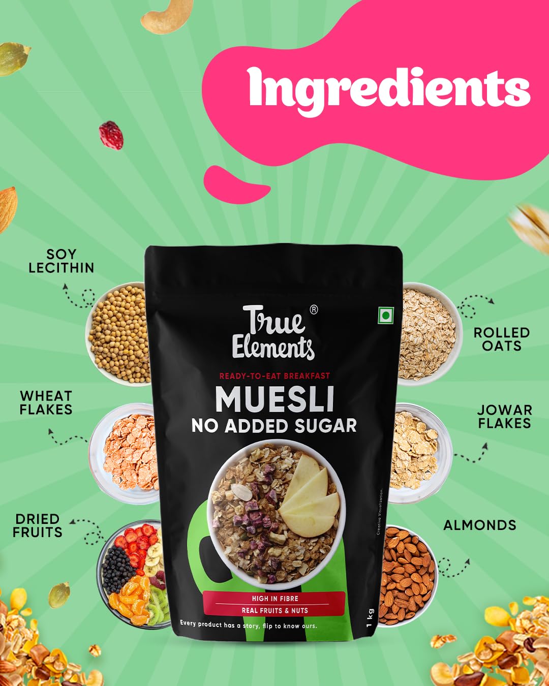 The Real No added Sugar Muesli: True Elements NO ADDED SUGAR Muesli is the perfect partner for anyone looking for a no added sugar breakfast option. It is made with 100% real and clean ingredients & ZERO ADDED SUGAR. Just add milk & your wholesome breakfast is ready in mins! We do not add any refined sugar or Malt Extract or Malitol. No honey/date syrup/jaggery is added. Even the fruits and the grains like Jowar and Wheat Flakes used in this Muesli are completely sugar free.
