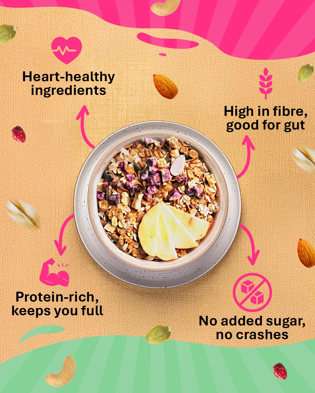 Super Seeds for Super You: Enjoy protein-rich & premium Chia Seeds & Pumpkin Seeds in this Muesli.