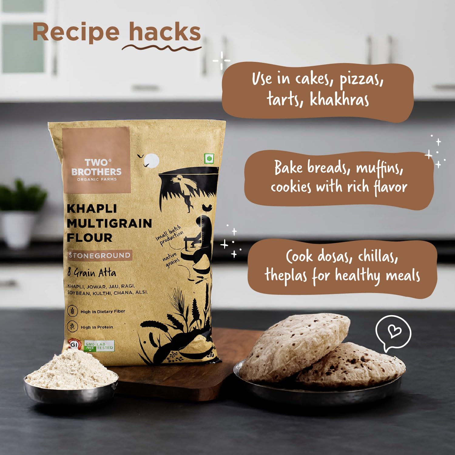 Khapli Multigrain Atta in daily recipes: chapatis, pancakes, naans, or even baking to enjoy a rich, earthy flavor and a boost of nutrition in everything from breads and muffins to dosas, theplas, and pizza bases.