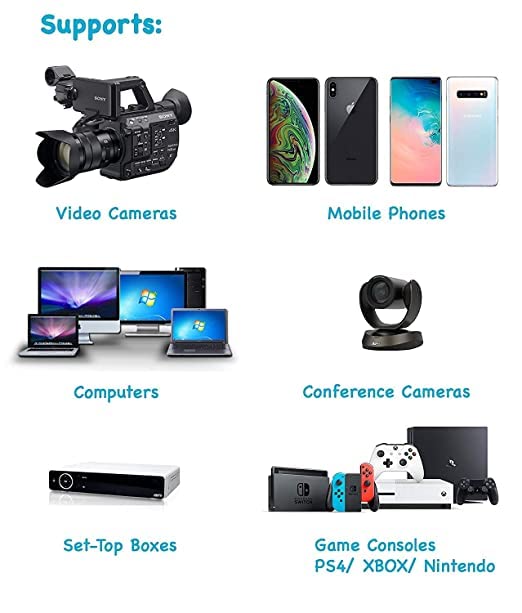 Compatible Devices: –Game console with HDMI input only,such as xbox one, PS4, Wii ,nintendo Switch etc. –Works with digital camera camcorders, not Gopro or other action cameras.
