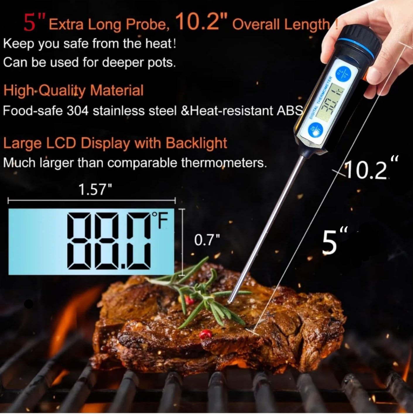 Extra Long 4-Inch Probe – Features a durable stainless steel probe that allows you to check temperatures safely without burning your hands. Perfect for food, liquids, BBQ, grilling, and candle making.