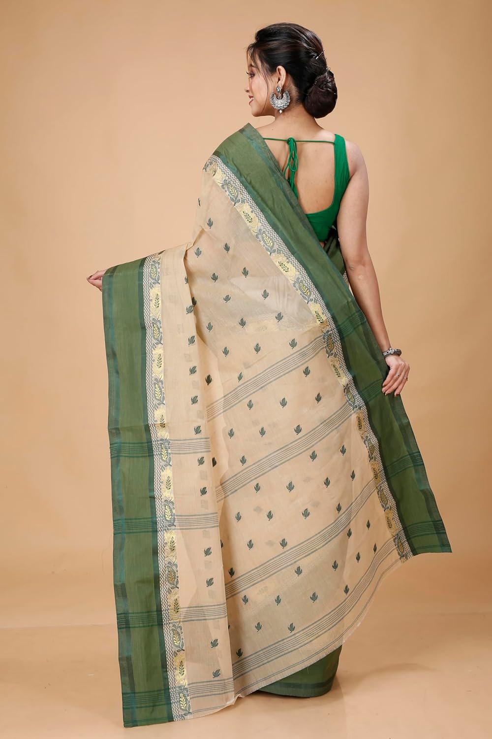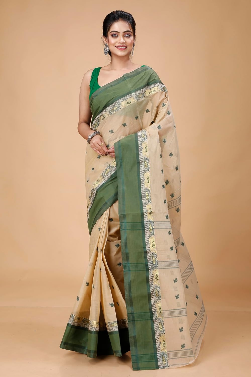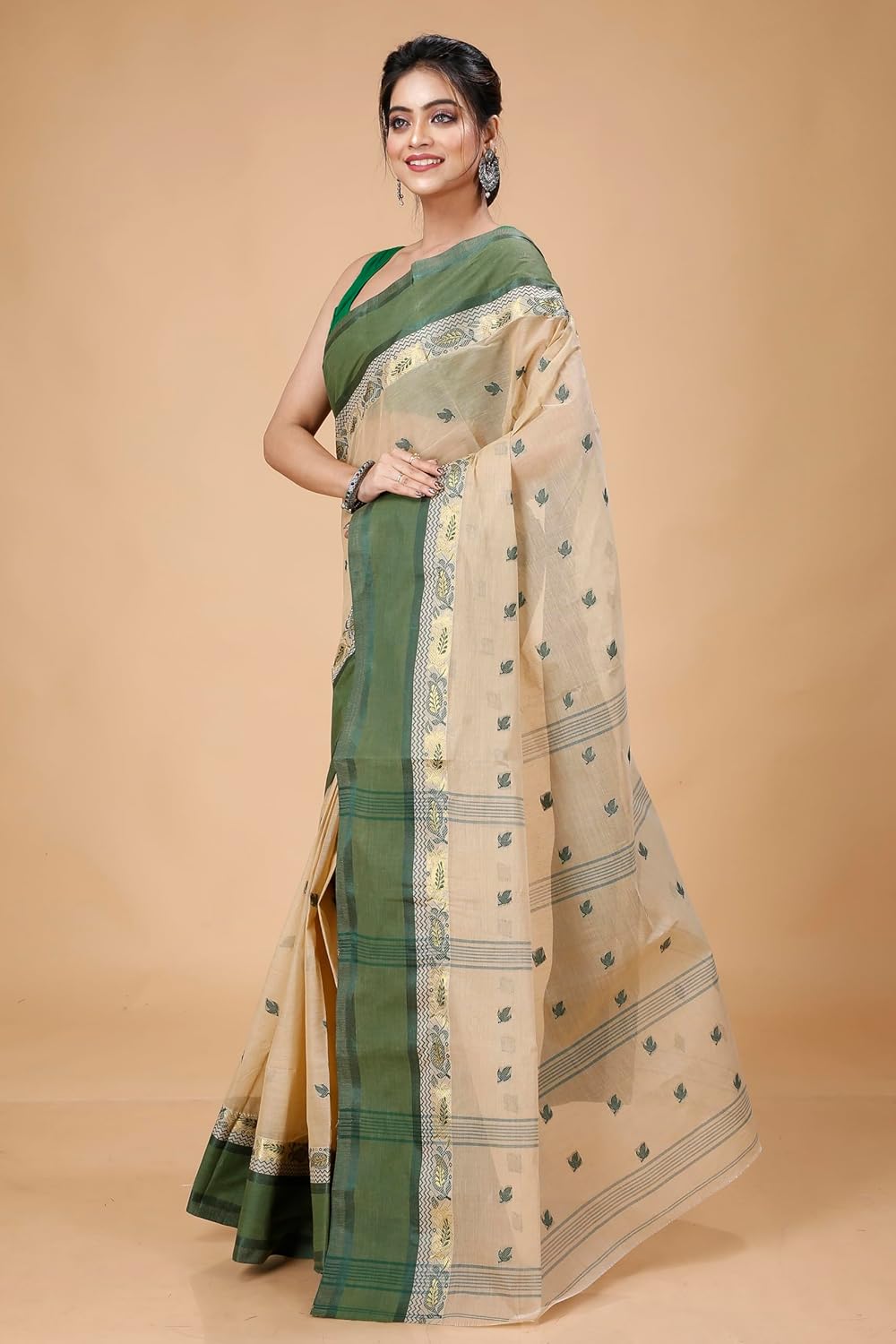 Women’s Traditional Bengal Tant Pure Cotton Design Border & Butta Tant Saree Without Blouse Piece