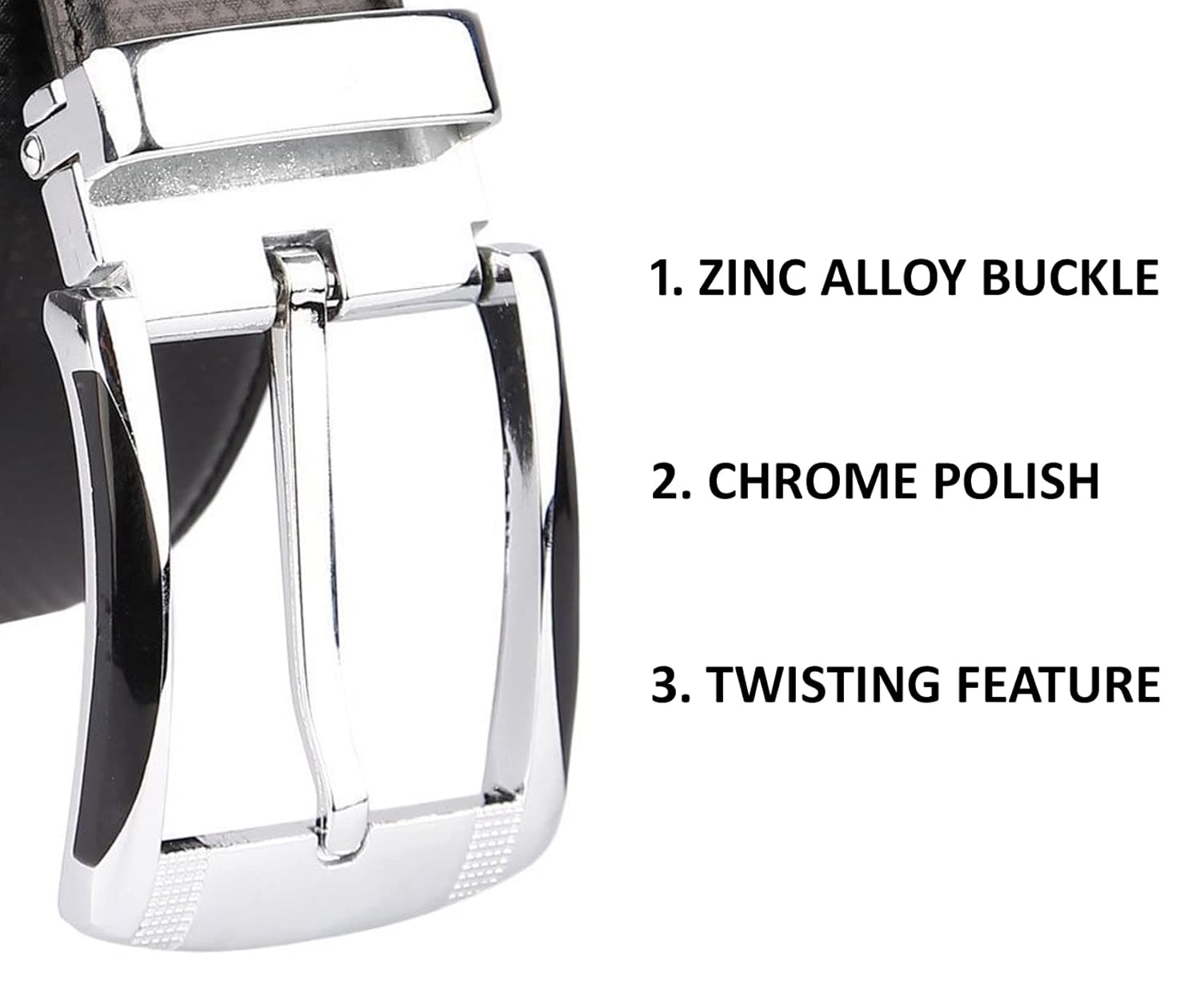 Buckle is made of Zinc metal and coated with chrome finish. Shiny buckle looks great on formal as well as casual attire.